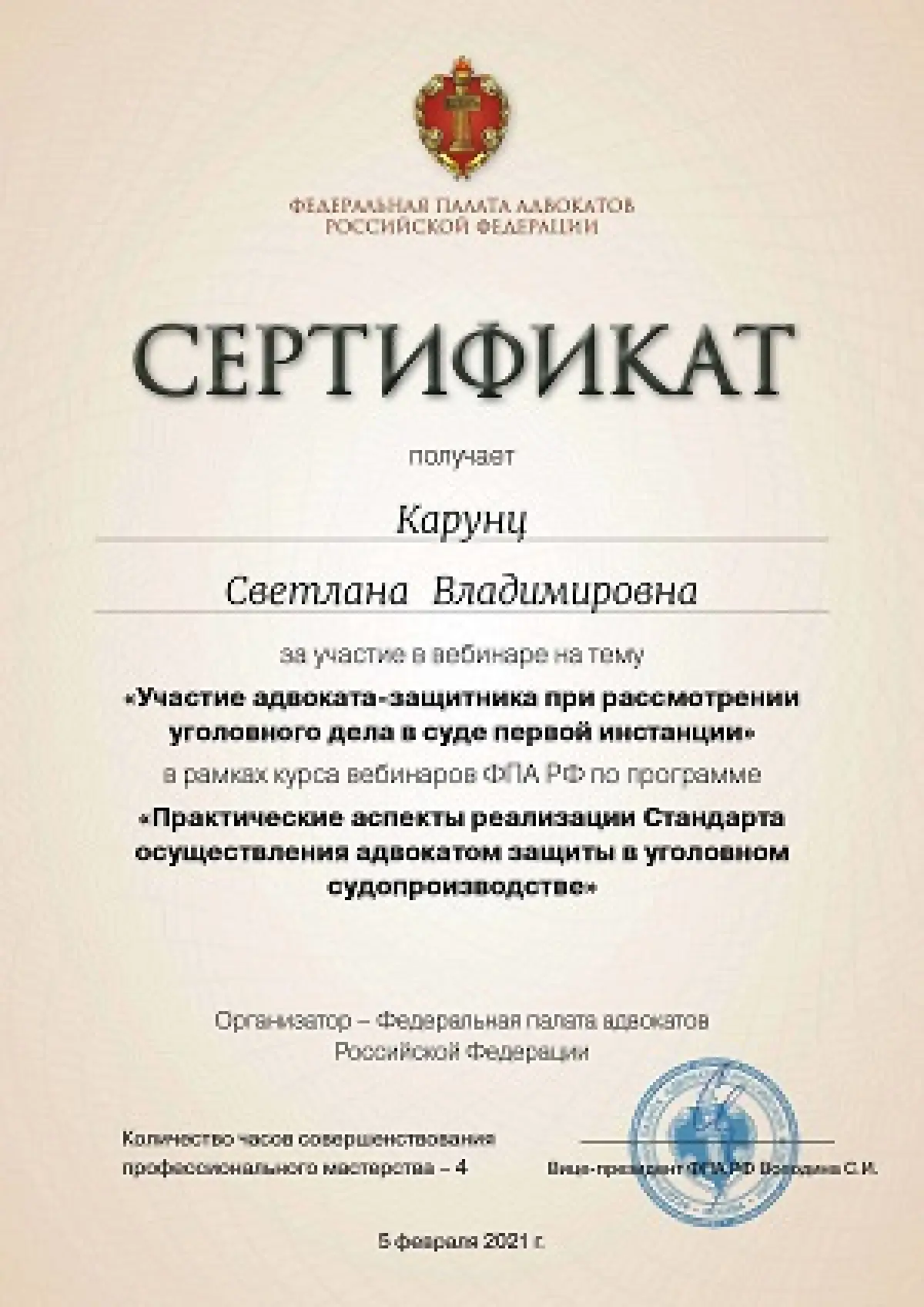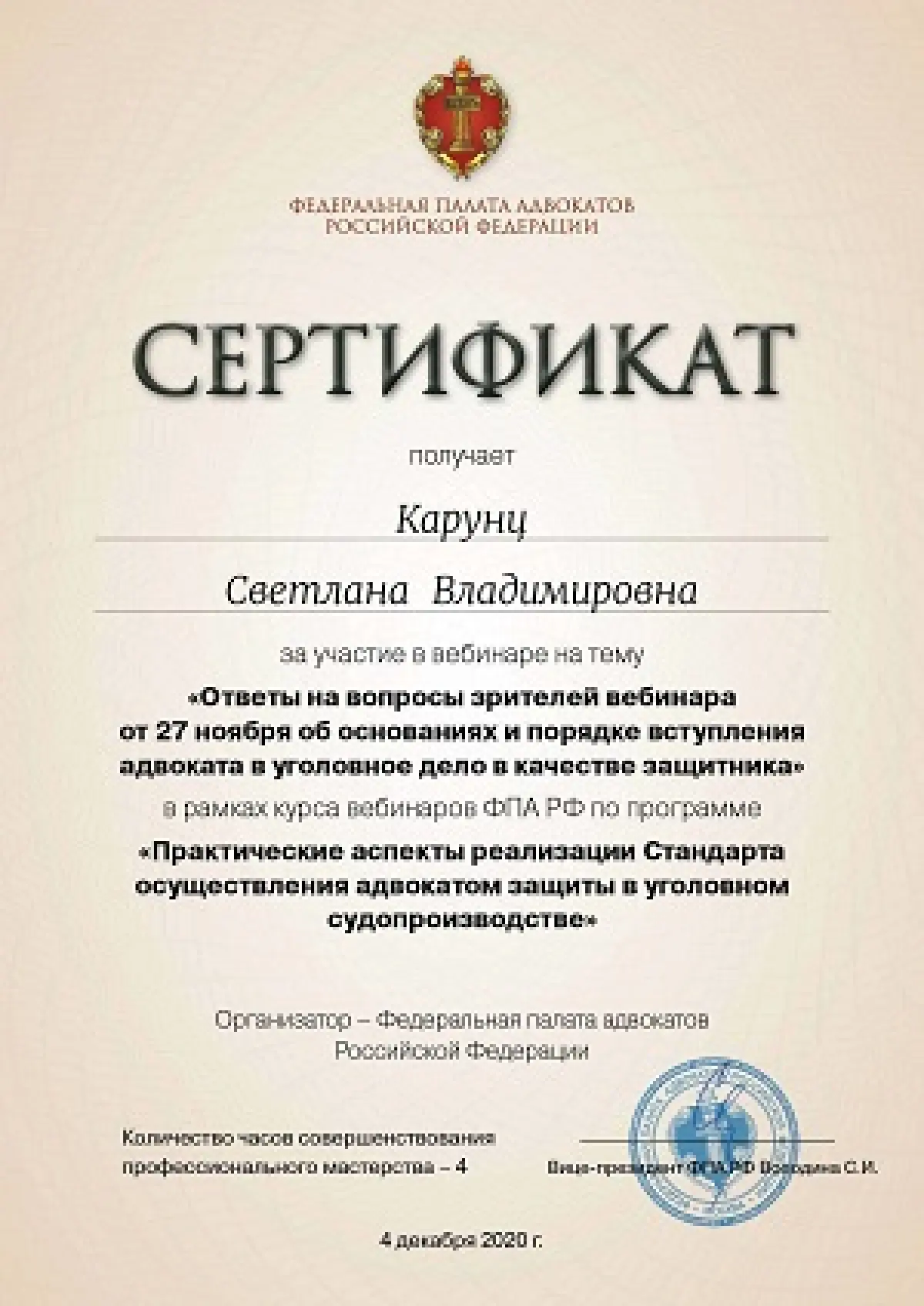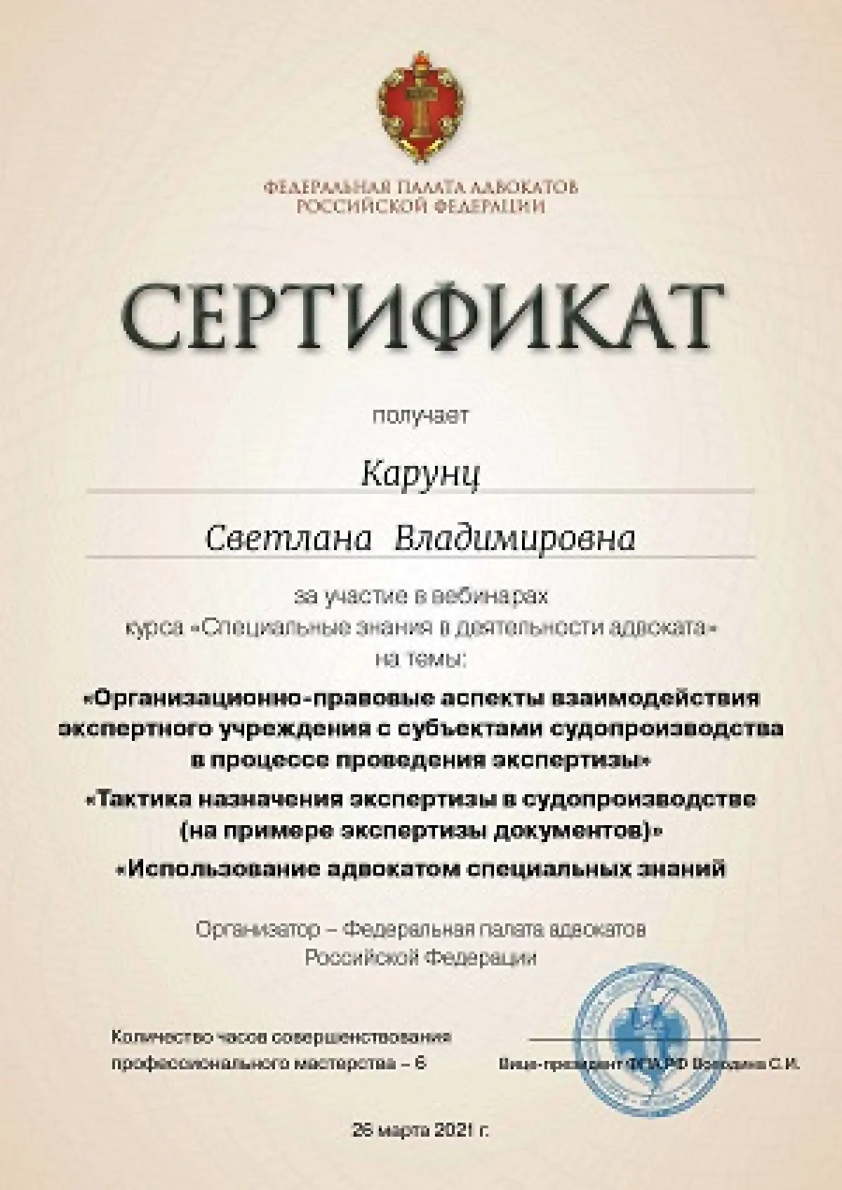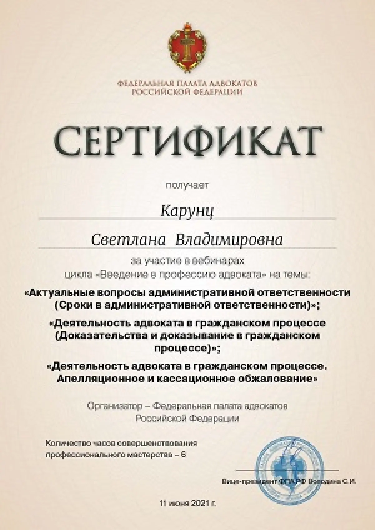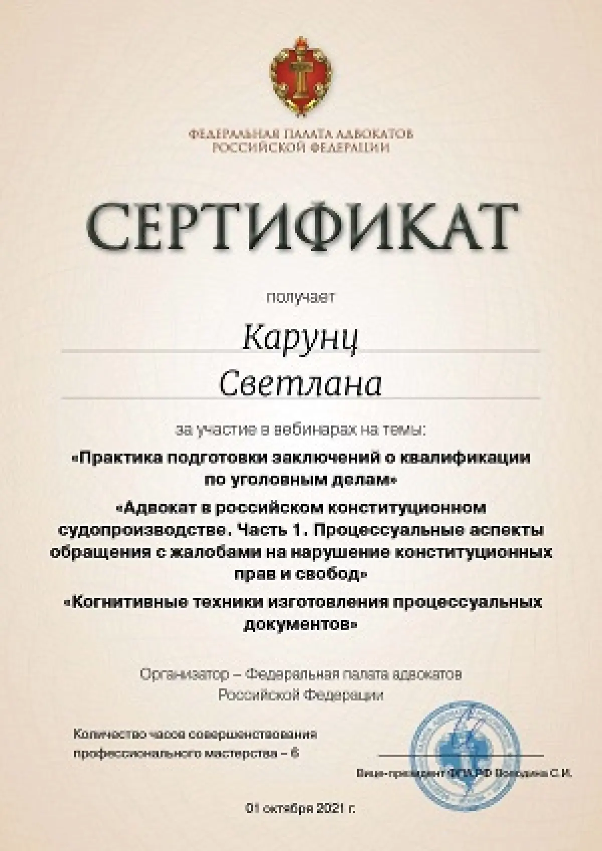 Я регулярно участвую в программах повышения квалификации в виде семинаров, лекций, вебинаров по профильным тематикам, организуемых Адвокатской платой Московской области и Федеральной палатой адвокатов.