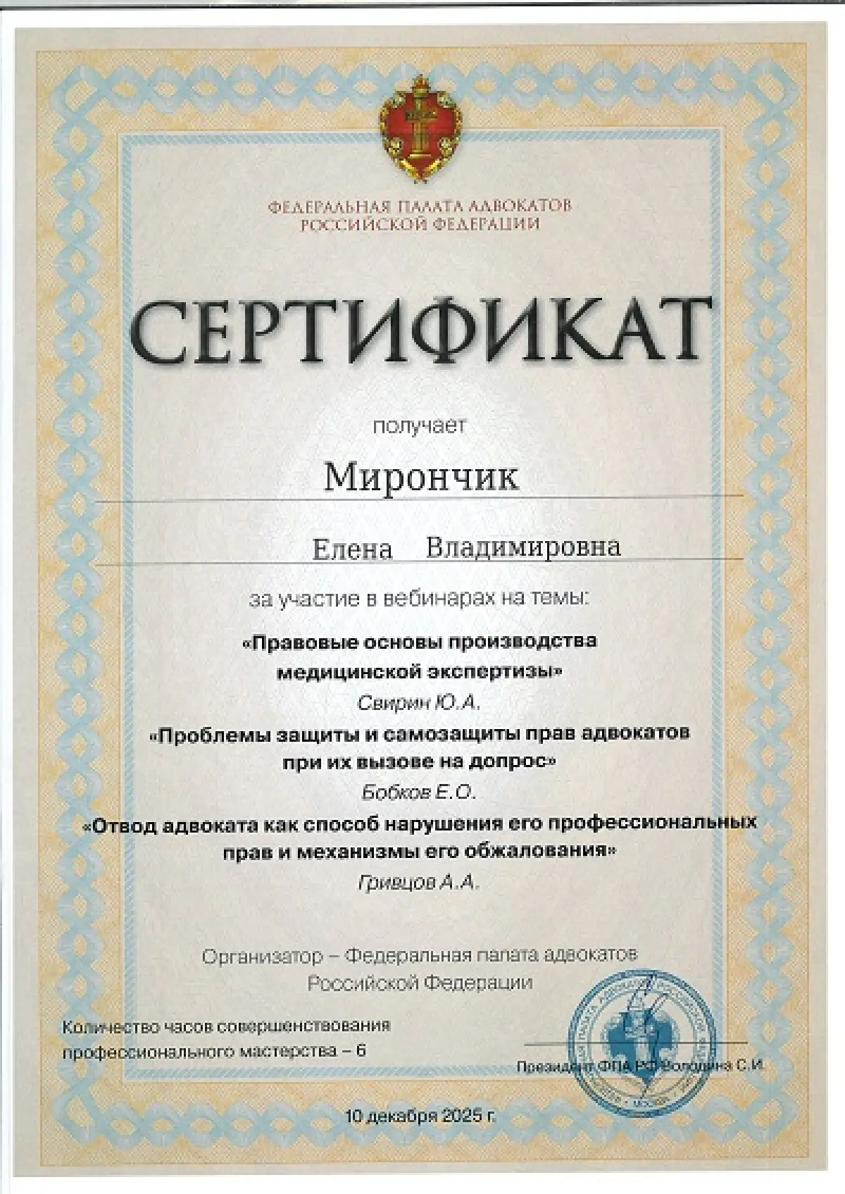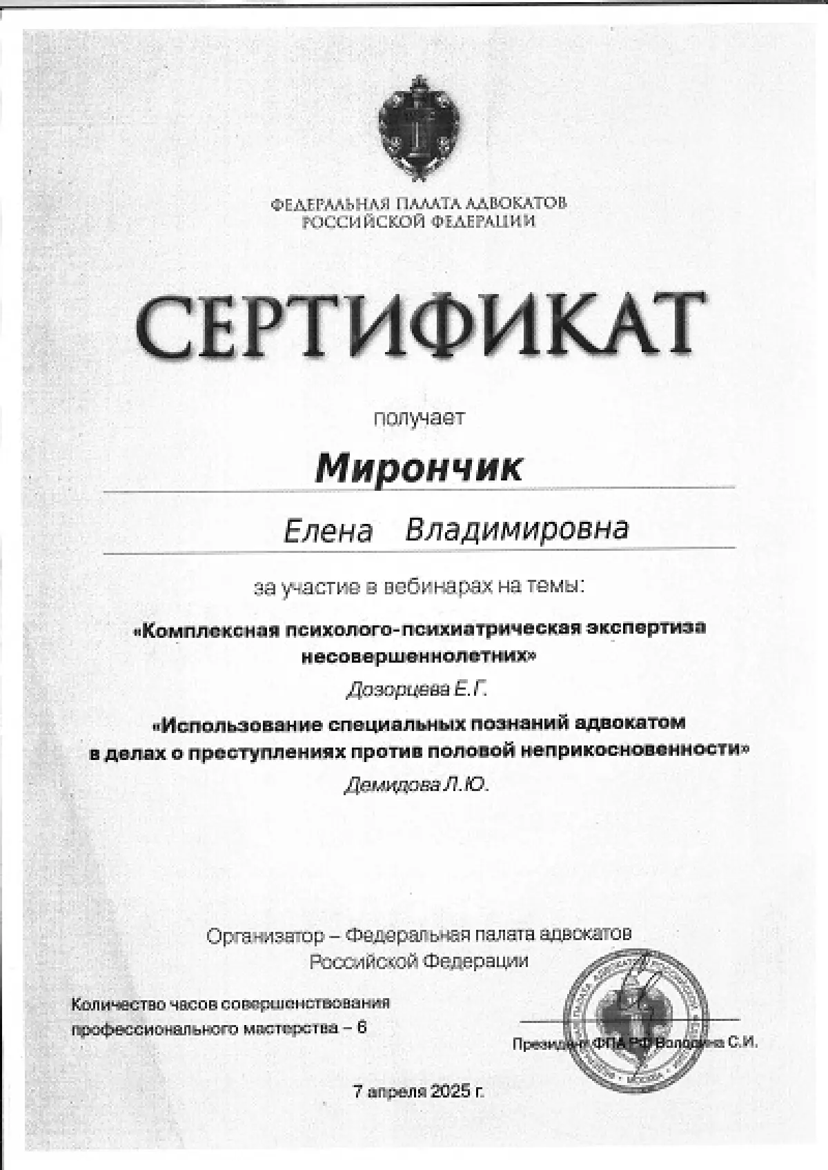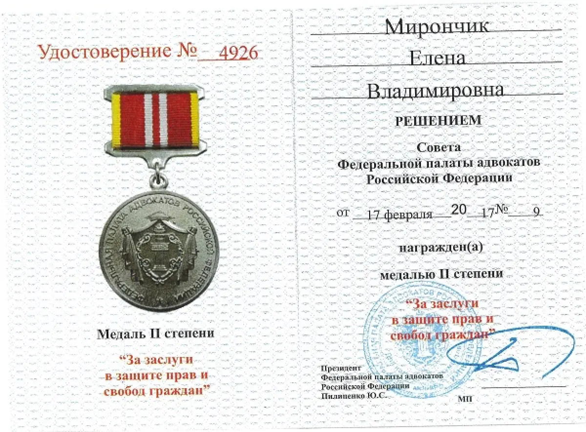 Мой профессионализм отмечен многочисленными наградами, включая диплом Адвокатской палаты Московской области, почетную грамоту Федеральной палаты адвокатов РФ и медаль ФПА РФ «За заслуги в защите прав и свобод граждан» II степени.